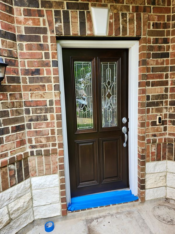This door was restained with a Dark Walnut gel stain and 3 coats of Old Masters "Ascend " satin Polyurethane with exterior UV protection